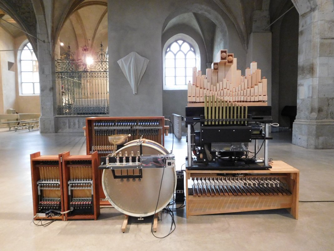 Die Instrumente stehen wie Skulpturen im Kirchenraum und scheinen selbsttätig zu agieren…. Sie korrespondieren mit den Schlagwerkregistern der Orgel … und ermöglichen vor allem eine weitere Verräumlichung der Musik.”